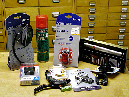 Zwei Wände des Verkaufsraums voll, ein Ständer voll, ein Fenster voll und ein Präsentationsfahrrad. Und trotz der Konzentration auf Artikel "rund ums Rad" hab ich nicht alles da. Aber wenn nötig liefert Ortlieb das Fehlende schnell nach. Sie können die Produkte bei Bedarf sogar direkt im Ortlieb Webshop bestellen und dann zu mir liefern lassen und abholen.